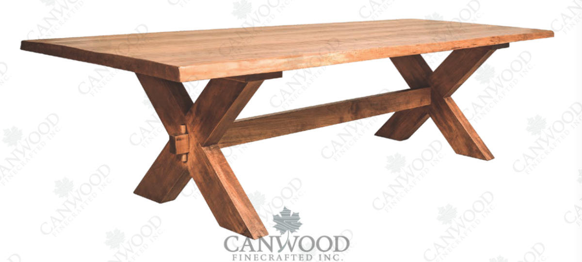 Cross Creek table comes standard with Slab Top with authentic live edge boards (wood boards, straight line cut, glued side by side to create a solid wood panel top). Available with square edge for the same price. This collection comes standard in summer cut live edge (no bark). Winter cut not available. Every live edge table is unique. Variance in width and thickness is a natural feature of live edge furniture. Variances of up to 6" in table width from specified width can be expected. Only available in solid top. No leaf options. Comes standard with table levelers. ***Standard rough sawn texture, optional smooth sanded (R) extra cost. Every table is unique. Variance in width and thickness is a natural characteristic our 1 3/4" live edge tops. Rustic smooth sanded only available summer cut. Optional turnbuckle stretcher for added cost. Rectangular Live Edge Glued Up Slab Top. #CPR: Chair Placement Restrictions. Smaller sized tables in width or length limit chair size, quantity, and placement. Chairs may straddle or conceal pedestal on end of table. Base placement and spacing is to allow smaller sizes to seat 6 chairs. One on each end 2 on each side of table. Example: 60" and 72" table lengths. Chairs may not fit between pedestals but around pedestal.Read More