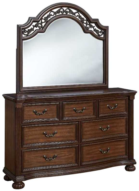 Take inspiration from the traditional luxury of this dresser with mirror. Classic with a rich cherry brown finish, its stately presence graces your room with an air of opulence. Your taste for exquisite details is satisfied with decorative drawer pulls and the mirror's ornate accent filigree.Read More